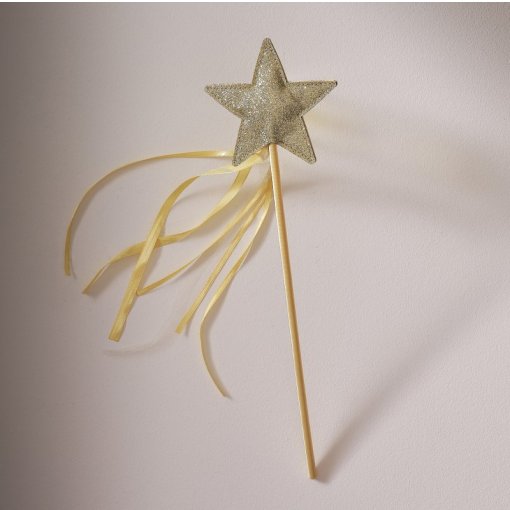Esta adorável varinha de fada é feita de cetim dourado e tem no topo uma estrela dourada brilhante.