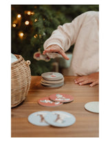 As férias são um ótimo momento para jogar juntos. Você consegue se lembrar dos lugares das cartas correspondentes na mesa? Este jogo de memorando fácil de jogar é divertido e educativo. Os cartões redondos apresentam belas ilustrações temáticas de inverno, que vão de bonecos de neve a renas. Embaralhe completamente as cartas e coloque-as de bruços sobre a mesa. Duas cartas são viradas a cada turno. Vence o jogador que conseguir igualar o maior número de pares. Memo pode ser tocado sozinho ou em grupos. Oferece entretenimento sem fim e ensina as crianças a esperar a sua vez. Além disso, o jogo de cartas contribui para o desenvolvimento de habilidades importantes, como concentração e foco.